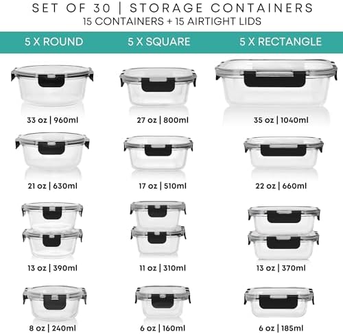 Our set includes 30 premium glass storage containers with lids in an assortment of shapes and sizes:
